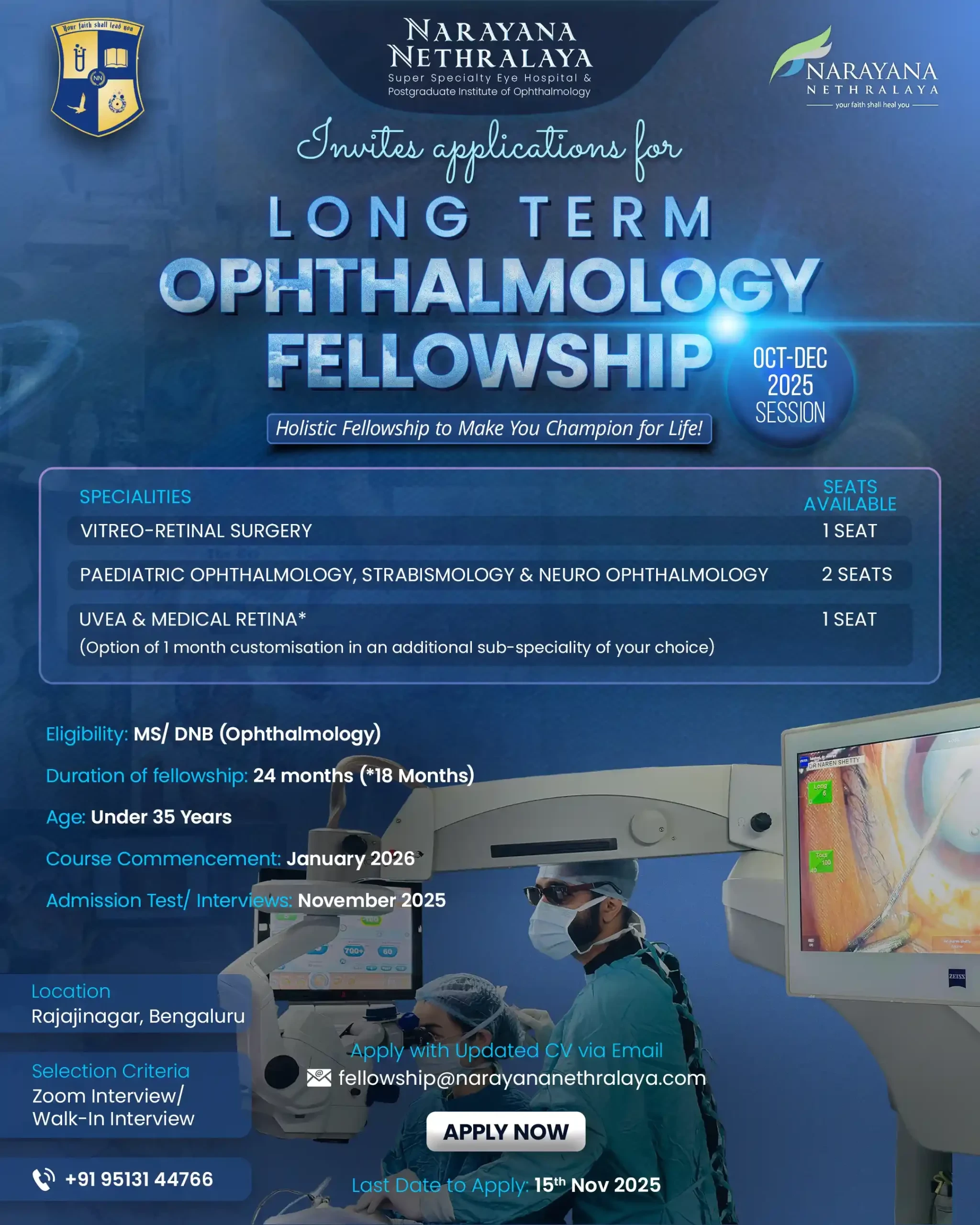 For those considering a fellowship, Narayana Nethralaya presents an unparalleled opportunity to work alongside some of the most distinguished professors in the field, many of whom have pioneered transformative research in ocular diseases. The institution boasts specialised research labs, including Karnataka’s only ocular stem cell, molecular, genetic, and ocular gene therapy facilities.