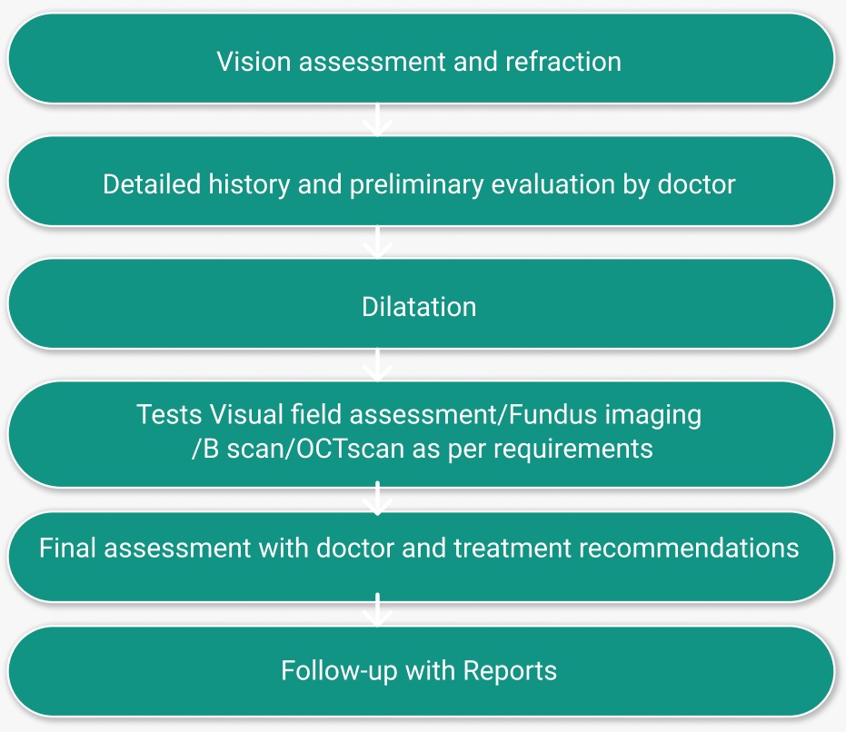 It includes assessment of visual acuity, color vision, pupillary reaction, assessment of the optic nerve appearance and function, assessment of the visual pathway from the eye to the visual cortex in the brain, assessment of extraocular movements, assessment of the field of vision and other tests as and when required.